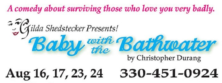 Gilda Shedstecker Presents! in August at the Kathleen Howland Theater, Christopher Durang\’s outrageous comedy, Baby with the Bathwater! When Helen and John bring their new baby home, they\’re much too polite to actually peek to see if it\’s a boy or girl, so they guess and name her Daisy. Or as Helen says, \”The doctor